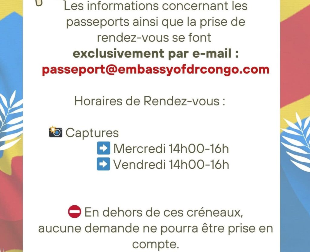 A noter que les autres documents devront être envoyés dans un UNIQUE mail à l’adresse suivante : passeport@embassyofdrcongo.com